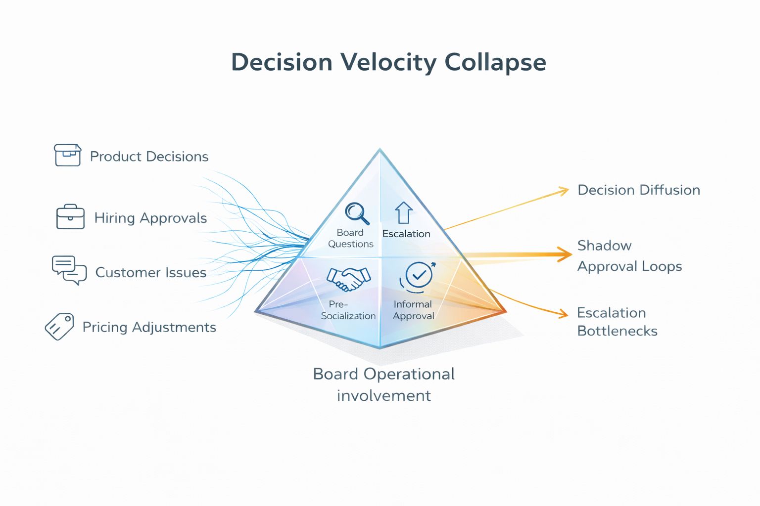Third, the organization develops learned helplessness around velocity: when decisions require board validation, teams stop making decisions altogether, waiting for permission that governance structures were never designed to provide.